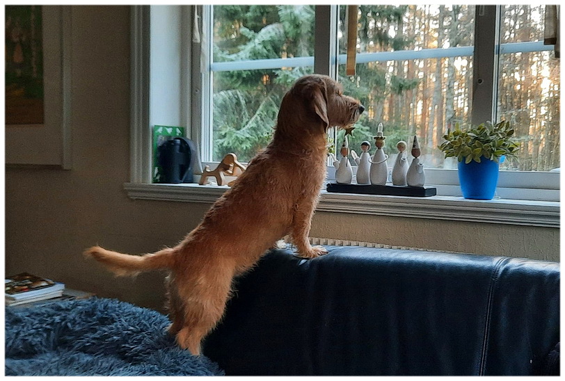hè!![]() Prachtig stukje voor als je echt in hondengedrag geïnteresseerd bent en zie hoe fantastisch honden zijn, leert hen begrijpen, wat een verrijking van je leven! ![]() Kip (pen) ik heb je! ![]() Soep is hier nog heet en moet een nachtje over heen gaan op het terras bij -13 en of het net zo lekker smaakt als Chris zijn erwtensoep moeten we nog maar afwachten☺ ---------- Dinsdagmorgen 11 februari. Geen verdere krabbel, gaan zo weg naar Karlstad. ![]() Onze 'bijna' huisgenoten! ik durf te wedden dat er geen hond is als Elin die zoveel reeën ziet dagelijks!☺ ---------- Maandagmorgen 10 februari. Hm gisteren dus niet getikt. Even terug in de tijd en begin bij vorige week. Halverwege die week voelde ik mij niet ok en leek ik verkouden te worden en was nog even bang griep te krijgen en dat woord gebruik ik ook zelden omdat tegenwoordig iedereen die een verstopte neus heeft, 'griep' lijkt te hebben en nooit meer een normale verkoudheid. Goed, ik had dus een normale verkoudheid die na een paar dagen met een sisser leek af te lopen. Zaterdag hadden we de hele dag een rustige sneeuwdag en eind van de middag kwamen J&A hier eten. De soep was heerlijk en het toetje ook . . . de hoofdmaaltijd was een deceptie. Ik had zo mijn best gedaan op een Italiaanse groenten ovenschotel, maar wij vonden het niet om te pruimen, Dick en ik hebben maar weinig gegeten en J&A? Eigenlijk wel een beetje lachen, ik denk dat zij het zielig vonden voor mij en hapten stevig door . . . als konijntjes kauwen op ongare groenten . . . ☺ Best wel gek hoor, niet dat het vies was maar op de één of andere manier waren al die groenten niet echt gaar geworden. Recept nog eens nagekeken en ik heb niets over het hoofd gezien, hoe gek, wat een slecht recept, gelijk klaar mee. Verder hebben wij het uiteraard weer hartstikke gezellig gehad, logisch toch! Werd een latertje en dan nog even rondjehondje en naar bed waar wij ons gelijk in Morpheus armen stortten. Gistermorgen wakker geworden en voelde mij weer niet zo lekker, totaal geen stem meer, warm en nog wat meer van die futiliteiten en neem daarbij mijn phpdtjes en het is compleet om je dag in ledigheid acceptabel door te brengen, Uiteraard weer mijn wekelijks programma gekeken, podcast geluisterd en daarna ben ik, hoe apart voor mij, een paar uur naar bed gegaan onder 3 donzen dekbedden, heerlijk. Gisteravond bij -12 wel rondjehondje en was lekker, voelde totaal niet zo koud! Het is nu prachtig winterweer, en ik zie op de trackerapp dat Dick in het mooie en voor de honden ook fijne Mjönäs loopt! Snel trackerapp weer uit anders word ik weer ongerust omdat het gps signaal te zwak is . . . Toch Dick maar even gebeld, niks aan de hand, zit al in de auto, sta nu stil, 3 elanden op de weg! ---------- Zaterdagmorgen 8 februari. Nee hoor nog geen nieuwe slappe piepkip, valt ff tegen hè! We gaan dinsdag naar Karlstad en daar is wat meer keuze vwb piepkippen☺en nu moet dat kleine opdondertje het maar even doen met piepballen in sokken. Dit is dus een goed manier om oude sokken helemaal tot op de draad te laten verslijten, er worden trek- en scheurspelletjes mee gedaan zowel tussen does en babyhondje als tussen Dick en de twee furry fellows. Gistermiddag nog lekker in de zon gewandeld en nu is het grijs en net onder 0. Dick is naar V. Skymnäs om te wandelen en mij wachten hh klusjes waar ik er al een aantal van gedaan heb. Inmiddels staan er al weer dozen klaar voor verschillende bestemmingen, de stort, de papierbak, de gewone loppis, en de mazzels, we gaan goed zo! Naar de loppis gaat goede kleding, die willen de mazzels niet, en begrijp ik. We zijn dus lekker aan het gesorteerd opruimen en voelt goed. ![]() Het is zo boeien, vind ik dan, die ijskristallen ![]() Mijn trouwe mini kerstboompje, heel lang geleden gekocht bij Deen in Swifterbant, voor op de tafel. De enige buitenplant die de verhuizing naar het noorden overleefd heeft en inmiddels een aardige grote boom in pot is!