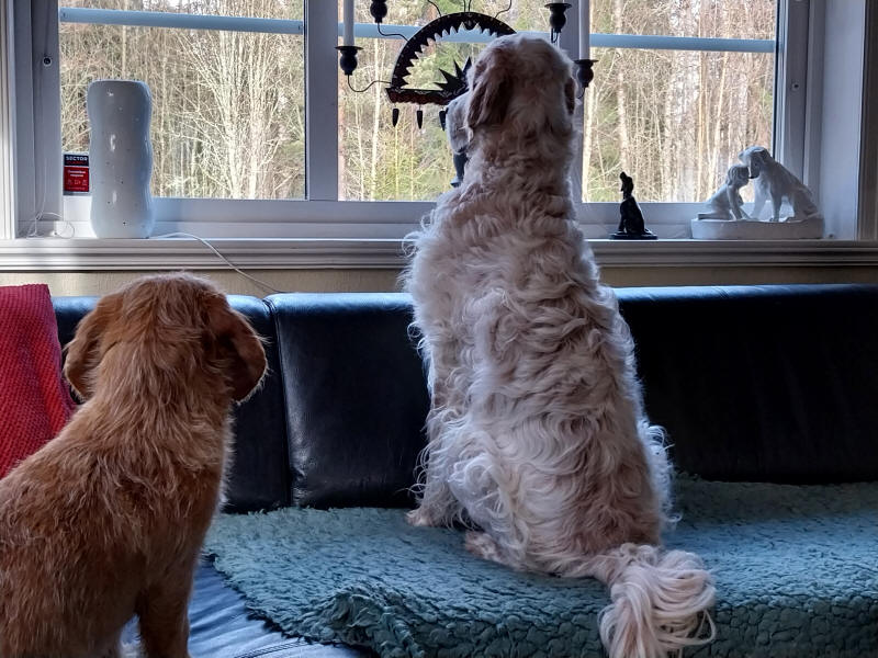 ![]() Zoek Dirkus☺ ![]() Kappelientje heet zij nu ![]() Samen het lot dragen ![]() Ook gewoon spelen kun je met een kap ![]() Ja en dit was dus vanmorgen ---------- Dinsdagmorgen 28 maart. Ja die elanden hè, nog steeds vinden wij het zo leuk! Schreef ik gisteren zo nonchalant dat nu de pleister er af mag bij pop, nou ik kan jullie wel zeggen dat mijn hart in mijn keel klopte bij deze exercitie. Ik ben niet meer zo stressbestendig terwijl ik een paar jaar terug nergens, nou nérgens is ook overdreven, maar zeker voor dit soort dingen mijn hand niet omdraaide. Er zitten tegenwoordig zulke prachtige pleisters op operatiewonden, met zo'n doorzichtig plaklaagje er langs en ook ik weet dat dit gewoon dagenlang, zo niet wekenlang kan blijven zitten. Ik had ook zo'n plakkaat en kon er gewoon mee douchen zonder een enkel probleem. Dus had ik al aan een hoekje gepulkt bij pop en het deed haar pijn . . . Hier kan ik dus echt niet tegen, om mijn hondje pijn te moeten doen en ben gaan googelen, hoe een pleister makkelijk te verwijderen. De handigste manier voor mij was met sudocrème (had ik toevallig in huis) er op smeren, even wachten en dan er af peuteren. Hup crème wat zachter gemaakt door in een bakje warm water te zetten, op de randen gesmeerd en ondertussen wilde pop de geur kwijt raken en het is goed dat zij zo fijn luistert en ik haar kon vasthouden. Daarna pop op de trimtafel, Dick met een bakje met lekkers voor haar neus en ik ondertussen pleister weg halen en dat ging buitengewoon goed! Het plastic randje was slap en liet los, er gebeurt kennelijk iets chemisch met dat materiaal. Dank je google! Verder hebben we buitengewoon mooi weer, stevig gevroren vannacht, blauwe lucht, geen wind meer en de warmte van de zon al goed te voelen. De dagen zijn al veel langer, eigenlijk net zoiets als in NL en jammer genoeg niet meer eten met kaarsen aan, dat vind ik dus iets minder leuk. Gisteravond ook dat leuke programma over het Hoge Noorden gezien? Het eerste stel met peutertje wat volledig off grid woont, woont ongeveer 120 km zuid westelijk bij ons vandaan. Leuk om naar te kijken en ook heel bekend want onze omgeving ziet er eigenlijk ook zo uit. Van die plekjes waar wij graag met de camper staan, maar dan zonder huisje natuurlijk. De mensen in Noord Noorwegen bewonder ik wel, al 15 jaar zo afgelegen wonen en met die extreem lange donkere winters, poeh daar moet je echt tegen kunnen. Maar ook zij hebben hier maatregelen tegen getroffen door een huisje voor de winter in Denemarken te kopen! Ik verheug mij op de rest van de uitzendingen en in feite kunnen wij het al kijken via NPO Start of Plus, waar wij op geabonneerd zijn, maar gaan dat niet doen. Wel is het zo dat met name Zweden steeds aantrekkelijker wordt voor toeristen, goed dat het zo'n groot land is . . . Ach die arme Sam Til, hij vindt het dus heel vervelend zo'n kap en gelijk heeft ie! Gek genoeg heeft pop helemaal geen hekel aan die kap en steekt gewoon zelf haar hoofd er in bij het omdoen, wel makkelijk en zij heeft ervaring . . . ---------- Maandagmorgen 27 maart. Met Laura gaat het echt goed, vandaag gaat de pleister er af, moest na 3 dagen, tenzij de pleister nat was van bloed of andere ellende, dan moest het eerder, dat zou dan een bron van bacteriën worden, pleister gelukkig kurkdroog! Maar, dan nog iets . . . gisteren een dag met een gouden sterretje . . . Eind van de middag, ik ben in de keuken bezig, afzuigkap staat aan, gerommel met potten en pannen, komt Dick in de keuken en zegt 'ohh Von kijken, elanden!' Staan er gewoon twee elanden naast het terras, een moeder en een zoon van vorig jaar denk ik, rustig te eten van de stapel berkentakken! Wij waren helemaal opgetogen, nog steeds trouwens, wat een gave belevenis! Kijk, de reeën zien we elke dag, en nog vinden wij dat verschrikkelijk leuk, maar elanden zo dichtbij voor je neus, in je eigen tuin, is natuurlijk echt kicken! Zij keken ons recht in ons potje, niet bang, geen vluchtgedrag, terwijl de afzuigkap aan stond en de opening op 2 meter afstand van hen! Kortom, het was dik genieten, veel foto's gemaakt en een filmpje wat ik op fb gezet heb. Het was alsof de natuur ons een cadeautje gegeven heeft na de doorstane vervelende toestanden! ![]() ![]() ![]() ![]() Geweldig toch! ---------- Zondagmorgen 26 maart. Weer wat bijgekomen en we konden de rit gisteren naar huis gewoon afmaken. De eerste tijd veel sneeuwval, maar autobaan ok, prachtige wintertaferelen, rode huisjes met schuren bedekt met een dikke laag sneeuw, hoe mooi! Vanaf Kristinehamn werd de sneeuw steeds minder en lag er ook nog maar weinig, de weg smaller en sneeuw nam weer toe toen wij de Hagfors Kommun inreden en zagen tot onze verbazing ook later in Munkfors meer sneeuw, niet al teveel maar wel een hoeveelheid die het net mooi maakt. Half vijf thuis, heerlijk. Gelijk camper leeggehaald en aan de warme choco met slag, wat wil je nou nog meer? Met pop gaat het goed en zij loopt gewoon op haar pootje, ik durf hier bijna geen beentje meer te zeggen, maar zeg dat normaal wel altijd. Omdat zij vanwege die infectie echt strenge rust heeft en vreselijk moeten oppassen dat zij niet aan de wond gaat likken (zit pleister op) en ook de andere honden niet, oef moeilijk voor Elin, loopt zij zoveel mogelijk met de kap op en loop ik te politieagenten. Ik weet niet of iemand weet hoe lastig zo'n kap is en vooral het geluid wat dat ding maakt, ergens tegen aan lopen of schuren. Wij weten dit van de vorige operatie, toen hadden wij een klein rennetje in de kamer waar zij 's nachts lag met de kap op en aangezien ik altijd een oog op de honden wil hebben, staan alle deuren open en hoorde je steeds als zij ging verliggen rats weer langs dat hekwerk met die kap. Dus bedachten wij nu wat anders, en ik heb eerlijk gezegd wel getwijfeld of ik het in mijn krabbel zou zetten . . . Ik heb vannacht gewoon hier in bed geslapen met pop, zonder kap, en Dick in de camper op het grote bed met Elin☺ Kijk, 2 personen en twee honden in ons be