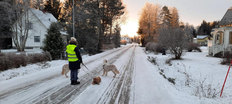 het blauwe pijltje wonen wij![]() Eigenlijk is het een soort rekje voor het raam, kan niet anders, het zijn 3 lagen glas ![]() Kneuterig effect ---------- Woensdagmorgen 8 februari. Het dooit als een gek, jammer genoeg, maar je kunt nou eenmaal niet alles hebben en voor april krijgen wij nog sneeuw genoeg. In de ochtend lopen wij tegenwoordig altijd een ronde met honden aan de lijn en aan één kant minder leuk maar aan de andere kant leren zij zo wel goed aan de lijn lopen en dat is toch echt iets wat bij de opvoeding van onze vorige honden geen aandachtspuntje was. En daar loop je dan echt wel eens tegen aan. Vanmorgen kwamen wij de vuilnisauto weer tegen en dat was een puntje voor Elin, dat grote lawaaiding en binnen korte tijd heeft zij hem nu geaccepteerd en is er niet bang meer van. Nou was 'bang' wel een erg groot woord maar leuk vindt zij het niet. Grappig via FB heb ik wat contact met de bazin van Tedje, een broertje van Elin, die in de binnenstad woont, waar weet ik niet. Zij moet wel lachen om Elin met al die interesse in wild want zegt zij, 'voor Tedje zal het niet wilder dan een muis worden'. Dat vind ik humor en zie het voor mij en begrijp je ook gelijk hoe de omgeving meespeelt in de ontwikkeling van deze eigenschap en om rustig met een Fauve te wandelen je beter in de stad kunt wonen! Nou ik niet hoor, laat dat even clear zijn! Maar daarom nuttig dat wij ook met hen aan de lijn over straat lopen en het leven niet alleen draait om los door het bos te jekkeren. Inmiddels is Elin geestelijk aardig uitgebalanceerd, en vermaak ik mij kostelijk met het observeren van haar en hoe zij met Roos en pop om gaat. Op Roos heeft zij niet veel vat, die draait zich gewoon om en moet af en toe een sprintje maken en op de bank springen om haar terroristische activiteiten te ontlopen, nou ontspringen dan. Als Bretagne wil spelen en de spikkels liggen te slapen heeft zij een leuke tactiek, zij loopt rond, snuffelt eens aan de Engelse neuzen en kijkt of er al wat leven in zit en zo niet, dan gaat zij naar de speelgoedbak en kiest naar mijn idee, zorgvuldig, wat uit. Springt tegen de bank en duwt het speelgoed in de snuit van poppetje, die dan wat reageert maar soms heeft pop geen zin, dan loopt Elin telkens opnieuw naar de speelgoedbak om wat anders te pakken, dit kan gewoon zeker 10x zijn en ligt de grond voor pop bezaait met speelgoed waar Elin steeds uitsloveriger mee doet. Uiteindelijk staat pop op, wordt kennelijk het juiste aangeboden en wordt er gespeeld. Werkelijk, ik kan tijden lang naar dit schouwspel kijken! Honden? ![]() ---------- Dinsdagmorgen 7 februari. Wel grappig, ons hele leven wonen wij al in nieuwbouwwoningen, met vloerverwarming, tot nu in Zweden, en echt waar, nog nooit zo'n heerlijk huis gehad, terwijl ons huis dit jaar al 74 wordt! Ik kreeg dan ook de vraag, omdat ik al gezegd had dat er zo enorm veel NLers, Belgen en ook Duitsers naar Zweden komen, of er zoveel nieuw gebouwd werd. Nou niets van dat alles, iedereen koopt of huurt een gewoon Zweeds huis en maakt er wat leuks van! Vooral onze regio is erg in trek en heeft ook te maken met de afstand tot NL, sommige mensen rijden in één of twee dagen naar NL, wat niks voor ons is, alleen in tijden van nood uiteraard. Zo boven de grote meren, waar wij wonen begint het echte rustige gedeelte van Zweden met veel natuur, stilte en een fijn klimaat. Ik ben een grote fan van Lapland, is duidelijk verder, maar toch té ver om echt te willen wonen. Over de hondjes, alles is weer helemaal ok, geen stinkende winden meer gelukkig want Joke werd zo af en toe bedwelmd hier . . . Laura lag naast haar en het is verboden om honden hier van hun plaats te sturen☺grapje hoor! Inmiddels heeft Elin de zaak hier goed in de Franse handjes en vooral Dick weet zij perfect voor haar Bretonse karretje te spannen, hij vliegt voor haar . . . zij heeft hem betoverd. Ik zie dit regelmatig tandenknarsend aan, vooral op GT gebied. Toen ik nog hoofdzakelijk alleen over de opvoeding ging, zowel honden en kinderen en geen man 24/7 om mij heen, was het absoluut veel makkelijker en ik kon veel consequenter zijn en vooral met een Fauve is het toch echt noodzakelijk om geen water bij de wijn te doen. Dick vindt snel iets zielig of gewoon flauwekul, maar wel even eerlijk zijn Yvonne, met het ouder worden is ook mijn standvastigheid wel wat minder geworden! ![]() Smelt . . . ![]() Lekker stel en Roos blijft meestal buiten schot, de slimmerd! ---------- Maandagmorgen 6 februari. Opgestaan en alweer verrast worden door heel mooi licht, bevroren bomen en de zon zien opkomen, wonderschoon! We hebben gisteren weer heel gezellige uurtjes met Joke en Anne gehad, lekker gesmikkeld en Joke had een taartje mee, zelf gemaakt die eigenlijk wel voor meer dan 4 personen bedoeld was . . . gewoon gedeeld door vieren . . . Ja en dan moet je nog eten ook en ik probeer er altijd wel wat van te maken, resultaat? Ik lag vannacht met maagpijn in bed en wist niet meer hoe ik liggen of zitten moest, geeft niet, het was het waard. Maar voor zij kwamen gistermiddag, Dick was met de meiden weg, had ik voor de hondenkinderen wat stukjes kip gekookt en ben iets gaan doen, vergat het en kwam de kamer in, alles blauw onder de rook! Totaal zwart geblakerd pannetje snel buiten gezet. Alle deuren en ramen tegen elkaar open, jezusss -6 graden buiten dus leek het wel een vrieskist hier en uiteraard rook iedereen die binnen kwam evengoed die helse lucht. Snel pelletkachel aan en binnen een kwartier was het hier weer aangenaam, dat gaat razendsnel gelukkig! Toen J&A weg waren ben ik de rommel in de keuken gaan opruimen, Roos wilde naar buiten voor een plasje dacht ik en opeens zag ik haar door het raam, pannetje open gemaakt, werkelijk brandschoon leeg gebikt, hoe krijgt zij het voor elkaar? Gaf ook een aardig resultaat want Dick is er vannacht 3x voor haar uit geweest omdat zij moest kotsen. Nu is alle leed weer geleden, hondjes ok, ik ook geen maagpijn meer en buiten is het een sprookje met di