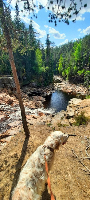 ![]() ---------- Zaterdagmorgen 15 juli. Omdat Elin het gistermiddag ook weer aardig bont maakte en je er hier achteraan wilt of moet, zul je door de wildernis moeten struinen en berregie op want paden zijn er niet. Helaas bleef de sleeplijn niet eens ergens aan hangen . . . Het is een stuk terrein waar jaren geleden gekapt is en dat is een puinhoperige zooi en kost aardig wat moeite om daar door heen te ploegen. Die honden hebben er geen enkele moeite mee en ook pop doet dit alles gewoon mee, Roos niet meer en die was ook thuis gebleven bij deze expeditie. Ook merken we duidelijk dat wij ouder worden, het is wat strammer allemaal en de zin om een end de bush in te moeten is ook niet aanwezig en daarbij jaja de familie schijtbak natuurlijk. Vanmorgen besloten wij om het rustig en zonder stress te houden en hadden we Elin aan de rollijn, ook geen grap trouwens, dat moet dan maar 1x per dag, al is het maar voor onze geest. Net erg aardige NLers gesproken die een vakantiewoning gehuurd hadden en vandaag weer richting NL gaan en hoe toevallig, precies het huisje wat wij werkelijk járen geleden hadden willen huren! De laatste paar dagen ben ik super ijverig bezig in huis om leuke typisch Zweedse gordijnen te maken en hoop vandaag de laatste af te krijgen en op te hangen, zal er zo even een fotootje van maken. Gewoon rechte lappen met kant er tussen, lijkt makkelijk maar is wel secuur uitrekenen en dan vooral met stof wat scheef geweven is en ik al niet profi ben met dit soort dingen is dat wel een klussie. ![]() Deze hangen dus in de eetkamer, heb ik gekregen en ben ze aan het namaken voor de zitkamer ---------- Vrijdagmorgen 14 juli. Was een beetje een tegenvaller want er is nu helemaal geen randje strand meer, alles onder water en zelfs het greppeltje niet meer te zien en geen paadje, maar alles water. Uiteraard ging Elin in één ruk toch naar het strandje, dacht zij in haar jeugdige optimisme. Ik hoorde haar in het water, zag haar niet en dat zit mij dan niet lekker want zij heeft wel die lange sleeplijn en kan dan makkelijk achter die begroeiing op de bodem blijven hangen en niet verder kunnen. Ja hoor, het was weer zover, alle apen en beren kwamen gelijk op de weg dus ik broek opgestroopt, had hem beter uit kunnen doen en waden door het water, plotseling zag ik haar staartje en liep zij langs het water om de weg terug weer te vinden. Gelukkig luisterde zij gelijk, kwam zwemmend de greppel over dus BRAAFFFFFF Het is wel te merken dat zij dit terrein inmiddels op haar Franse duimpje kent en dus ook avontuurlijker geworden is, best lastig. Op de berg in de middag kun je dat ook zien en moeten we er niet aan denken geen tracker te hebben! Wat ook wel eens vervelend is dat tracker soms geen internet verbinding heeft, dat maakt je direct wel erg onzeker en peinzen wij er toch over voor haar zo'n professionele jagers tracker met kleine antenne te kopen . . . kassa . . . Hij zal vast zijn geld wel opbrengen want zij is natuurlijk nu nog maar 11 maanden en kun je er een hoop plezier van hebben. Wij zijn ook weer even naar de waterval gegaan omdat wij hier thuis het geluid zo af en toe kunnen horen en ja hoor, in één woord, prachtig! ![]() De waterval van Munkfors ![]() Stuk hek bij waterval zodat je niet met je auto het water inrijdt, denk ik dan eigenlijk . . . ---------- Donderdagmorgen 13 juli. Grote goden wat een regen gisteren, het leek wel een douche op volle sterkte en leek ook zo doordat het loodrecht naar beneden stortte. Gistermiddag dus een natte hondenronde en gisteravond maar een kortje gemaakt omdat het nog steeds plensde. Dit maak je zelden mee hier, dat het zo extreem regent. Nu weer prima weer trouwens. Gistermiddag kwamen Joke en Anne met hun zoon, die een paar dagen over is uit NL, even een bakkie drinken, gezellig weer. Vanmorgen gingen we naar het strandje maar . . . er was helemaal bijna geen strandje, zoveel water gevallen dat het waterpeil erg hoog was. Als we naar beneden gaan via een klein paadje moet je op rivierhoogte een klein greppeltje over en zelfs dat kon niet, ja de honden deden dit wel al zwemmend, zelfs Roos ging er door, en zagen we in de 'verte' Elin zo de rivier in stappen en zwemmen, zij bleef wel aan de kant gelukkig want wij konden er zo maar niet bij komen. Vandaag was zij ook van 'god los' en maakte er een potje van met omleidingen die wij natuurlijk kunnen volgen op de tracker, godzijdank. Daarbij luistert zij toch best redelijk naar de fluit en komt dan terug, maar niet gelijk natuurlijk (mag dat ook niet echt verwachten, is geen Setter) . . . je ziet haar dan stil staan op de tracker en kennelijk even nadenken wat zij dan moet doen en keert dan om, klein donderstraaltje. Geeft ons (en hen!) wel een voldaan gevoel nu zij dan heel lekker liggen te slapen na een spannende ronde! Maar eerlijk is eerlijk, ondanks alle maatregelen vinden wij het niet echt fijn zo'n 'exploring dog'. . . Weer goed opgelost Peter en wat een fijn idee dat die knobbels ongevaarlijk zijn! ![]() Zie in het midden Elin en bijna geen strandje! ![]() Het kleine paadje naar het strand, diepe greppel! ![]() Blij mee! ---------- Woensdagmorgen 12 juli. Moeilijk tikken met 1 vinger en leppie gedeeltelijk op de linkerzijde leuning stoel, op rug pop, maar ik weet dat zij hier snel genoeg van krijgt en dan wat gunstiger gaat liggen. Haha nu dus al en komt er nog een Fauve ook bij om het gat tussen mijn leppie en pop op te vullen, lachen hoor, zoals je mij nu ziet zitten! Onze ochtendronde is tamelijk droog verlopen, korte bui toen wij op het strandje waren maar mocht ons niet deren en de honden ook niet al was Elin wat minder gemotiveerd om 'haaitje' uit het water te halen. Helaas moeten wij wel constateren dat Roos qua krachten beduidend minder wordt, het heuveltje naar beneden gaat nog wel maar naar boven zie je dat het haar moeite kost en wij paraat staan om te helpen. De bespiering op de achterhand is zo goed als verdwenen en is ook goed te zien als zij op de bank op haar rug ligt,