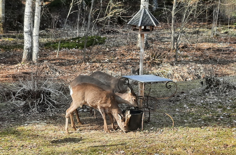 ![]() De fruitbomenman in actie -------- Zaterdagmorgen 22 april. Vandaag de bergwärme maar eens lager gezet, de warmte begon mij te vervelen, hebben hem de hele winter op 19 graden gehad en dat is helemaal prima, zelfs met min 18 maar voor nu, mij te warm in huis. Ook hier komt er vanaf maandag of zo weer een koude dipje en maar zien hoe dat verloopt. Voorlopig nog even zomerweer, vandaag 20 graden! Dick legde net alle kussens weer buiten op de stoelen en ook voor de meiden de kussens maar zij willen er alleen maar op liggen als wij ook buiten zijn, gekke hondjes toch. Lekker gerommeld met mijn nieuwe fototoestel en je kunt er zoveel mee en mezelf kennende gebruik ik dat alles nooit, lekker op automatisch en verder geen gedoe. Ik vond gisteren sowieso een grappige dag met leuke uitschieters, ten eerste de zege van Richard de Mos, in zijn onschuld heb ik altijd al geloofd (simpelweg een politiek proces) en het andere Inez Weski achter de tralies, en ook daarvan kijk ik niet van op . . . Hieronder wat foto's, uitprobeerseltjes fototoestel, van vanmorgen met onze huisreeën. Een perfecte schutkleur, mooi toch hè, zo in je tuin! Hier staat bokkeman te kijken naar Dick die weg liep! ---------- Vrijdagmorgen 21 april. Vandaag de dag dat ik 'spulletjes' uit NL aangekregen en uitgepakt heb, meegenomen door de Viking. Heel blij mee want eindelijk mijn nieuwe fototoestel, staat nu op te laden en straks lekker uitproberen! Ook diverse spulletjes van Paracord om nieuwe halsbanden voor de meiden te maken, ja sommige dingen laten we uit NL komen, zolang dit nog zo makkelijk gaat want ook de Viking heeft plannen om zich hier definitief te vestigen en waarom moge duidelijk zijn . . . Ook het boek 'De stikstof fuik' is er bij en leest Viking nu eerst. Met de tandarts had ik een Babylonische spraakverwarring, want geen kies trekken maar ik had een afspraak bij de MH en dat deed de tandarts grotendeels zelf en het polijsten deed de assistente, en nu binnenkort kies trekken. Deze twee behandelingen kunnen niet gelijktijdig. Ik ben zeer tevreden over de behandeling in die privékliniek, aardige mensen, zeer toegankelijk. Nog wat boodschapjes gedaan en eind van de middag thuis, even hondjes wandelen, we hadden alleen Elin mee, en daarna naar Viking, die net met horten en stoten, aanhangerpech onderweg, uit NL was gekomen. Altijd gezellig dat ook hij weer in de buurt is. Gisteravond afgedraaid en vroeg in het mandje. ---------- Donderdagmorgen 20 april. Het lijkt wel zomer maar . . . zie dat er volgende week een dagje sneeuw komt! Maakt niet uit, nog nog een aantal dagen genieten. Korte krabbel, of eigenlijk geen krabbel want we vertrekken zo weer naar Karlstad waar o.a. ik naar de tandarts moet, kies is lastig. ![]() ![]() ---------- Woensdagmorgen 19 april. Nahh, stonden vanmorgen de reeën naast de garage strak naar boven naar het raam te kijken hoe de zaken er voor stonden en of Dick al opschoot met zijn voer . . . Jeetje we waren helemaal niet laat, het was net 7 uur en kregen we al een verwijtende blik!☺ Nu gaan we wachten op het getik van bokmans tegen de garage, hij weet dus al dat daar het voer vandaan komt, hij kan namelijk niet bij het raam tenzij hij zo slim en handig is om op het laddertje te klimmen. Het lijkt zo net of zij tam zijn maar dat is helemaal niet zo hoor, het blijven schrikachtige diertjes, alleen weten zij inmiddels dat zij hier niets te vrezen hebben en verwijderen zij zich maar een stukje verder als Dick met het voer komt. Gisteren alweer heerlijk gebbqd en was het 17 graden in de schaduw op de noordkant, heel lekker dus! Wij zaten in het bejaardenhoekje op het zuiden en zagen we de reeën ook wat meer op afstand ons te observeren. Ook voor hen weer even wennen, mensen op het terras en veel meer geluid we doen ook expres niet stil en leven ons leven. Wel letten wij er op dat Elin niet gaat blaffen en dat gaat heel goed, zij luistert al prima. Zij ligt constant onder de terrasrand door te loeren en te snuffelen en zolang zij het Bretonse bakkesje dicht houdt vinden wij dit goed. ---------- Dinsdagmorgen 18 april. Elke morgen hetzelfde ritueel, bij het opstaan gelijk een blik in de tuin werpen, figuurlijk dan. Altijd ligt meneer de bok er in de zon (als hij schijnt dus zoals de laatste tijd zeker, blik naar het huis gericht. Grappig want hij observeert ons gewoon vanaf een afstandje heel rustig, en luistert naar de huisgeluiden, de honden die over de houten vloer lopen, Elin die achter een bal aan rent, ik rammel met ontbijtspullen en als hij de voordeur hoort draait zijn hoofd met dat prachtige grote gewei die kant op. Zodra hij de garagedeur hoort springt hij op en rent huppelend deze kant op en springt over het greppeltje, blijft een paar meter voor Dick staan en zodra hij zijn rug laat zien komt bokkeman gelijk eten! Hij is wel altijd in gezelschap van zijn dame, die op wat grotere afstand volgt, zij is duidelijk wat voorzichtiger op een natuurlijke wijze, zij zal drachtig zijn. Bokje zit ook vast nokkievol testosteron! Wat geweldig toch hè, dat is dus wonen in Zweden, zo dicht bij de natuur leven en ondanks wat onvolkomenheden hier, echt nooit meer naar dat drukke NL waar het zo langzamerhand uit zijn voegen barst. Ik zeg wel 'nooit weer NL' maar laten we toch realistisch blijven, je weet het nooit van tevoren hoe de bal rolt. Hoewel het vannacht ook weer een paar graden gevroren heeft gaan wij er van uit dat de winter voorbij is, de spijkerbanden zijn ook weer van de auto, de zon schijnt uitbundig en ik heb zelfs al de donzen dekbedden gewassen en buiten gedroogd! Eigenlijk heb ik zin om de camper te pakken maar gek genoeg misschien, we vinden het thuis ook zo fijn, rondom natuur wat wij eerst altijd moesten opzoeken met de camper . . . . Wonen op vakantie heet dat hè Anna! ![]() Elin heeft nu goed door hoe je op de rand van de bank klimt ![]() Het zal Roos allemaal worst zijn, al staat er een hele kudde reeën ---------- Maandagmorgen 17 april. Mwah weer een mooie dag e