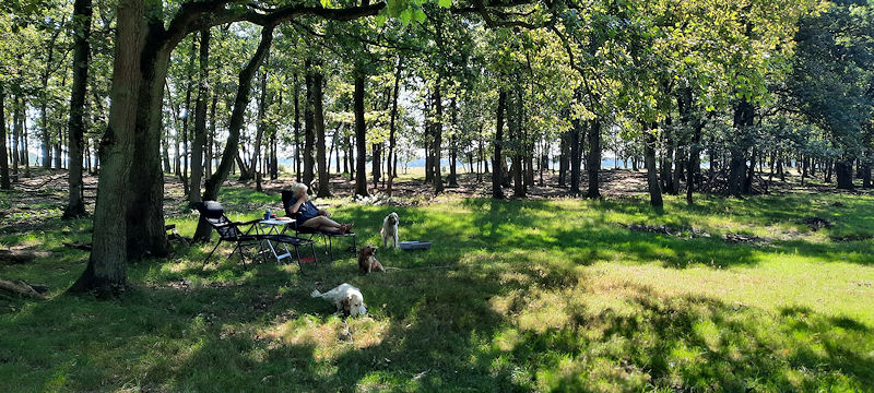 Een keurig gekapte Fauve! ---------- Dinsdagmorgen 5 september. Hertme of all places, in de buurt van Enschede. Het wordt hier vandaag veel te heet, 31 graden en ik hoef nu niemand meer iets uit te leggen. Gisteren hier naar toe gereden omdat ik om half 3 vanmiddag bij de trimster moet zijn met Elin. Staan nu op een betaalde camperplaats, wel mooi, alles goed georganiseerd hier, dat moet gezegd worden, all in prijs en is ook handig. De eigenaren vind ik niet echt aardig, kortaf, gewoon niet vriendelijke en 'grappig' genoeg was dat niet alleen mijn constatering maar las Dick ook in de recensies en pas ná dat ik dat zei! Het kleine weggetje waaraan het ligt hadden wij toch echt anders ingeschat, het is druk, veel autoverkeer waar wij vlakbij staan. Honden uitlaten? Een crime. Of je loopt langs die drukke weg waar veel te hard gereden wordt, op de weg, geen voetpad, of je loopt langs een heel smal greppeltje, ik denk 75 cm breed, met aan één kant schrikdraad. We hebben geen andere keuze dus ik loop met samen geknepen billen met de honden aangelijnd er langs, niet fijn en dan ook die k** hitte, nee ik ben niet in mijn goede doen en daar kan Dick niet zo goed tegen . . . Tot nu toe prijs ik elke dag dat wij in Zweden wonen waar het camperen, wandelen, autorijden én leven nog een plezier is, er moet alleen een AH zijn, dan was het pas echt af☺ Morgen gaan we een dagje Flevolanden, donderdag naar Harderwijk, honden enten bij onze vertrouwde dierenarts en daarna naar onze lieve vrienden Aad en Eefje. Sorry voor de leegtes tussen de alinea's dat ontstaat zo maar en ik weet wel hoe dat komt maar nu geen zin om dat te veranderen en daarbij, het leest eigenlijk ook wel makkelijk. Ik zit nu even in de camper te tikken, warm, maar buiten nog warmer.