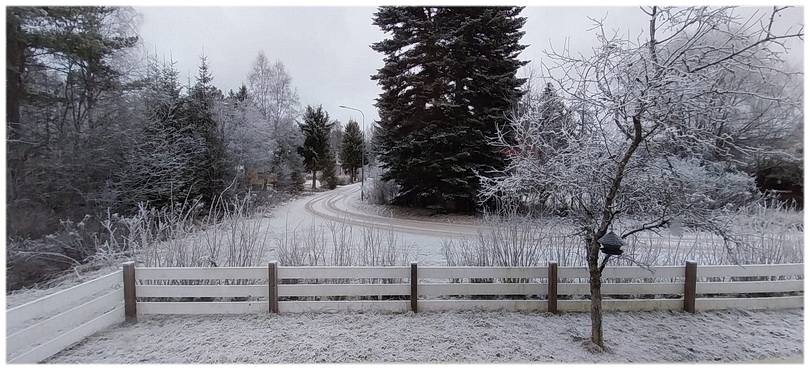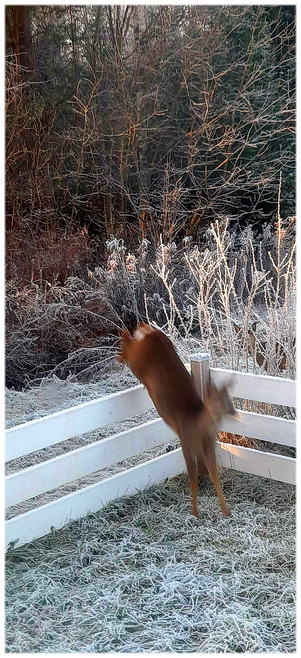 vrieskou, prachtig!Gelijk hier maar even een foto van vanmorgen uit het keukenraam, misschien gek maar dit maakt mij altijd zo blij! Gisteren kwam de flamboyante Manja weer even langs vliegen, zo kun je het gerust noemen ☺, grote goden wat een energie en na 1.5 uur moeten we echt even uitpuffen. Ik zeg niets wat verboden is hoor, want zij weet het zelf ook wel, al leest zij niet de krabbels volgens mij. Zij had haar 4 honden mee maar liet zij heel wijselijk in de auto, echt schatten van hondjes, ook voor iedereen lief maar om hier mee naar binnen te nemen is niet zo handig want dat wordt chaos, een kluwen spelende honden, rauzend over stoelen en banken. Leuk voor haar was wel dat de reeën hier weer af en aan door de tuin liepen rondom het hele huis, verwend in dit opzicht als wij zijn, kijken wij hier niet meer van op maar als er bezoek is, is dit natuurlijk heel grappig! Vlak voor zij opstapte zag zij het licht branden van haar auto en moest zij tempo maken, dat betekende donderjagende honden in de auto die zelf het licht aan gedaan hadden . . . Het blijft lachen hoor! ---------- Zondagmorgen 16 november. Vrieskou en voorlopig blijft dit ook zo en nog geen sneeuw in het vooruitzicht, ja ik zie iets staan voor over een week. Maar zover vooruit geloof ik het niet meer. Was gisteren weer gezellig met J&A naar de kerstmarkt. Eigenlijk vind ik er geen fluit aan hoor, sfeerloos en elk jaar en elke kerstmarkt dezelfde meuk te koop, maar goed een mens wil wel eens wat en met hen samen maak je er nog wat van☺ Op het grote terrein ligt een mooie echt oude Herrgård, waar een overvol restaurant is waar je amper in kunt komen en lang in de rij voor veel te dure koffie moet staan, geen optie dus, daarbij is het terrein te groot om het sfeervol te maken. Na 1.5 uur, nog lang, waren wij het zat en zijn we naar ons huis gegaan om lekker koffie te drinken en te babbelen. Vandaag gaan we geloof ik, je weet het hier nooit zeker, aan de slag om wat kerstspullen van de zolder te halen. Toegegeven, de slag om babyhondje zelf te trimmen heb ik verloren, mij veel teveel werk waarbij ik verkeerde krachten moet zetten met mijn schouder, dus maar contact met de Zweedse Fauventrimster Yvonne (ja echt waar) gelegd en heb ik een afspraak voor 2 december. Wel een endje weg . . . hmmm 226 km . . . Tja, we willen geen knoeier aan ons hondje ---------- Zaterdagmorgen 15 november. Bij het opstaan vanmorgen -8, lekker toch! Gisteravond bij het laatste avondrondje uiteraard ook al koud en de meisjes voor het eerst weer een truitje☺ ik vind dat altijd zo schattig staan . . . Vanmorgen dus voor de grote ronde, jasjes aan en Robbedoesje daarover haar reflectiehesje, mochten de jagers, indien aanwezig, denken dat er een wild dier loopt met een knalrode vacht . . . Nou ja beetje gek gezegd hoor, net of jagers overal op zullen schieten en dat is absoluut niet zo, daar zijn strenge regels voor. Wat heerlijk Ria, wat een vooruitzicht, nog tot halverwege maart 2026 (!) in Spanje, wat een luxe hè! Ik heb Daimus opgezocht en ik zag dat daar veel mooie campings in de buurt zijn, keuze zat. Als het gaat zoals wij het in gedachten hebben, vertrekken wij eind januari '26 ook naar het zuiden, Spanje, Portugal of Zuid Frankrijk, net waar het goed weer maar stationair op één plek doen wij niet, vinden wij (nu nog haha) te saai. We hebben nu net al lang op dezelfde plek gestaan en vonden dat wel even mooi geweest, gelukkig denken wij daar beiden zo over. Kreeg net weer zo'n leuk filmpje van Agnes uit Spanje en dat maakt mij zo blij en verlangend naar camperreizen, zo fijn! Vooralsnog vind ik het nu heerlijk in Zweden en kijk echt uit naar nóg meer winter, prachtig! ![]() 'Mijn' perkje, nog niet af en gaat straks nog ff bikkelen worden . . . ---------- Vrijdagmorgen 14 december. Hoera daar is het échte Zwedenweer hoor, nou een tikkie dan! Alles weer wit van de rijp en twee bevroren auto's die dus nog niet in de garage stonden ☺ Bij het opstaan -5 en belooft een prachtige zonnige dag te worden, heerlijk, heeft een mens toch weer behoefte aan! Het ziet er ook voor de komende tijd echt winters uit. Hier in de omgeving zie je al veel kerstverlichting, dat is elk jaar deze tijd, ik denk mede van oudsher omdat de dagen best al kort zijn en dit toch wat lichtheid brengt. Daarbij zijn hier de kerstmarkten ook weer begonnen en dat is sporadisch in december, gek landje hè. Morgen gaan wij met Joke en Anne naar de kerstmarkt in Ransätter, gezellig. Dick is van plan om zondig ergens een kerstboom vandaan te gaan plukken en ook wij gaan aan de kerstverlichting buiten beginnen. ![]() Vanmorgen ![]() Gisteravond eetkamerraam ---------- Donderdagmorgen 13 november. Een krabbel tikken met één oog en één oor op de tv . . . het debat. Wat een gekwijl hoor ik weer, wat een toneelspelerij, goh wat zijn ze weer aardig tegen elkaar (nog wel), wat een geslijm, wat een flauwekul, wat een onwaarheden, wat een valse beloftes. Goed dat is even stukje politiek want ik kan het niet laten, het houdt mij veel bezig maar ik houd het buiten mijn krabbel. Het babyhondje had het vanmorgen bij het opstaan alweer heel erg druk, rennen over de rand van de bank voor dan het ene dan weer het andere raam, hijgend, en soms wat piepend, er waren wel 7 reeën en reetjes zijn niet altijd grappig tegen elkaar en je ziet de rangorde fitties! Dit maakt het gewoon heel leuk voor het kleine hondje☺ Robbedoesje heeft het tijdens de wandeling wel weer bont gemaakt met haar snelheid! Dick zag op de tracker dat zij op een gegeven moment niet gezien had dat hij een andere kant was opgegaan, zij stond stil en toen Dick floot spurtte zij zijn richting op en Dick zag dat zij een snelheid van 23 km had! Dit is echt wel heel erg snel voor een hondje met een niet zuivere achterhand! Haha