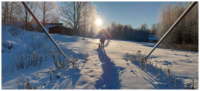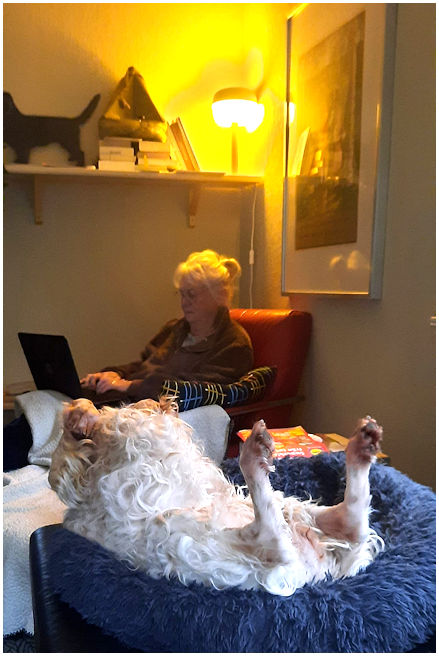 hè!![]() Prachtig stukje voor als je echt in hondengedrag geïnteresseerd bent en zie hoe fantastisch honden zijn, leert hen begrijpen, wat een verrijking van je leven! ![]() Kip (pen) ik heb je! ![]() Soep is hier nog heet en moet een nachtje over heen gaan op het terras bij -13 en of het net zo lekker smaakt als Chris zijn erwtensoep moeten we nog maar afwachten☺ ---------- Dinsdagmorgen 11 februari. Geen verdere krabbel, gaan zo weg naar Karlstad. ![]() Onze 'bijna' huisgenoten! ik durf te wedden dat er geen hond is als Elin die zoveel reeën ziet dagelijks!☺ ---------- Maandagmorgen 10 februari. Hm gisteren dus niet getikt. Even terug in de tijd en begin bij vorige week. Halverwege die week voelde ik mij niet ok en leek ik verkouden te worden en was nog even bang griep te krijgen en dat woord gebruik ik ook zelden omdat tegenwoordig iedereen die een verstopte neus heeft, 'griep' lijkt te hebben en nooit meer een normale verkoudheid. Goed, ik had dus een normale verkoudheid die na een paar dagen met een sisser leek af te lopen. Zaterdag hadden we de hele dag een rustige sneeuwdag en eind van de middag kwamen J&A hier eten. De soep was heerlijk en het toetje ook . . . de hoofdmaaltijd was een deceptie. Ik had zo mijn best gedaan op een Italiaanse groenten ovenschotel, maar wij vonden het niet om te pruimen, Dick en ik hebben maar weinig gegeten en J&A? Eigenlijk wel een beetje lachen, ik denk dat zij het zielig vonden voor mij en hapten stevig door . . . als konijntjes kauwen op ongare groenten . . . ☺ Best wel gek hoor, niet dat het vies was maar op de één of andere manier waren al die groenten niet echt gaar geworden. Recept nog eens nagekeken en ik heb niets over het hoofd gezien, hoe gek, wat een slecht recept, gelijk klaar mee. Verder hebben wij het uiteraard weer hartstikke gezellig gehad, logisch toch! Werd een latertje en dan nog even rondjehondje en naar bed waar wij ons gelijk in Morpheus armen stortten. Gistermorgen wakker geworden en voelde mij weer niet zo lekker, totaal geen stem meer, warm en nog wat meer van die futiliteiten en neem daarbij mijn phpdtjes en het is compleet om je dag in ledigheid acceptabel door te brengen, Uiteraard weer mijn wekelijks programma gekeken, podcast geluisterd en daarna ben ik, hoe apart voor mij, een paar uur naar bed gegaan onder 3 donzen dekbedden, heerlijk. Gisteravond bij -12 wel rondjehondje en was lekker, voelde totaal niet zo koud! Het is nu prachtig winterweer, en ik zie op de trackerapp dat Dick in het mooie en voor de honden ook fijne Mjönäs loopt! Snel trackerapp weer uit anders word ik weer ongerust omdat het gps signaal te zwak is . . . Toch Dick maar even gebeld, niks aan de hand, zit al in de auto, sta nu stil, 3 elanden op de weg! ---------- Zaterdagmorgen 8 februari. Nee hoor nog geen nieuwe slappe piepkip, valt ff tegen hè! We gaan dinsdag naar Karlstad en daar is wat meer keuze vwb piepkippen☺en nu moet dat kleine opdondertje het maar even doen met piepballen in sokken. Dit is dus een goed manier om oude sokken helemaal tot op de draad te laten verslijten, er worden trek- en scheurspelletjes mee gedaan zowel tussen does en babyhondje als tussen Dick en de twee furry fellows. Gistermiddag nog lekker in de zon gewandeld en nu is het grijs en net onder 0. Dick is naar V. Skymnäs om te wandelen en mij wachten hh klusjes waar ik er al een aantal van gedaan heb. Inmiddels staan er al weer dozen klaar voor verschillende bestemmingen, de stort, de papierbak, de gewone loppis, en de mazzels, we gaan goed zo! Naar de loppis gaat goede kleding, die willen de mazzels niet, en begrijp ik. We zijn dus lekker aan het gesorteerd opruimen en voelt goed. ![]() Het is zo boeien, vind ik dan, die ijskristallen ![]() Mijn trouwe mini kerstboompje, heel lang geleden gekocht bij Deen in Swifterbant, voor op de tafel. De enige buitenplant die de verhuizing naar het noorden overleefd heeft en inmiddels een aardige grote boom in pot is!