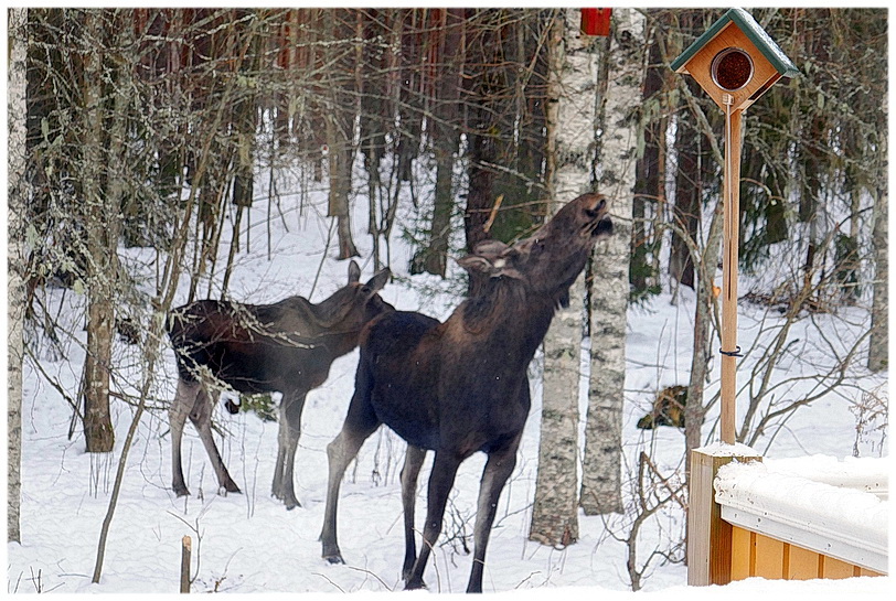 Dick met Lijntje, een hondje wat ik zo mee zou willen nemen! ---------- Donderdagmorgen 22 januari. Veel beleefd eigenlijk wel. Gisteren dus naar Karlstad, allemaal goed verlopen, mijn contact met de neuro is echt heel goed en ben ik zo blij mee! In de middag kregen wij een berichtje van Chris, onze kaas-worstman, dat er steeds reeën en 3 elanden door Mossängen liepen over de weg en hij zag hen vooral in ons straatje (zag hij bij zijn rondjehondje) OK leuk, dank je Chris! Voor ons toch niet ongewoon, wij wonen namelijk helemaal aan het randje van de bewoonde wereld grenzend aan een groot ruig onbewoond gebied vol met wild en zijn aardig wat gewend☺ Bij thuiskomst zagen wij veel grote sporen, inderdaad van elanden, rondom ons huis. Halverwege de avond blafte Elin fel en hoorden wij vlak er na een geluid alsof er een kudde paarden langs ons huis galoppeerde en toen ik buiten keek zag ik iemand met twee honden, overdadig behangen met knipperlichtjes halsbanden en reflectie en ik denk dat die elanden daarvan geschrokken waren. Goed, dan weet je dat de elanden constant in de buurt zijn maar daar hebben wij 'niets' van behalve dat het gewoon leuk is . . . Na 'winter vol liefde' ging Dick rondjehondje en adviseerde ik hem voor de grap om een zweepje mee te nemen vanwege de elanden . . . We hebben geen zweepje, en nam hij maar de fluit mee . . . Hij ging weg, ik hoorde Elin keihard blaffen en keek uit het keukenraam en kreeg de schrik van mijn leven . . . Dick was in een struggle met honden en een eland beland . . . Met twee armen uitgestrekt met de honden sprong een eland naast hem omhoog . . . Ik rende naar buiten, om te helpen, dacht nog net aan mijn camera (soort ramptoerisme ohhh?) . . . Eland kwam mijn kant op en Dick maakte dat hij weg kwam de andere kant op . . . Het imposante dier kwam onze tuin in en ik kon hem (nee háár, het was moeder eland) rustig filmen, zij keek mij aan en liep de tuin in en ging rustig staan knabbelen aan de appelboom. Dick kwam later terug en heeft 'gewoon' zijn rondje gemaakt en zag de twee elandenjongen in de tuin bij onze naaste buren staan, ook knabbelen aan hun appelboom. Hij vertelde dat hij de tuin uit kwam met de honden Elin gelijk ging plassen aan de overkant onder de grote dennenboom en hij plotseling direct achter zich gebries hoorde, omkeek en de eland naast hem stond waarop Elin panisch ging blaffen, van angst natuurlijk, Robbie zei helemaal niets . . . Eland sprong omhoog, wilde gewoon weg en dát moment zag ik dus vanuit het keukenraam! Dick zei wel dat hij nog nooit in zijn leven zó bang was. Je begint niets tegen zo'n grote sterke eland en je daarbij je kostbare hondjes in je handen hebt! Conclusie? Deze eland had geen kwaad in de zin, heeft daar dus gestaan met twee jongen, Dick kwam er aan, had hen niet gezien, de jongen verdwenen en de moeder trad beschermend op maar zag dat dit niet nodig was en probeerde ook weg te komen. Neemt niet weg dat je toch erg oplettend moet zijn hier☺ Gisteravond ontdekte Dick ook dat er een diertje onder de motorkap van de camper geweest is of nog, die aan het isolatiemateriaal heeft geplukt, en ja daar moeten we ook wat mee natuurlijk, ook niet ongevaarlijk. Vanmorgen ook weer 7 reeën in de tuin en een vreemde prachtige kat op ons terras . . . Uh saai hier? KORT FILLUMPIE KLIKKUH ![]() Hier was Dick net heel snel maar wel rustig, met een blaffende hond☺, het hoekje om gegaan, weg van die eland mwahhh ---------- Woensdagmorgen 21 januari. Zo de apen en beren heb ik ook weer even terug in hun hok gestuurd . . . Gaat goed met Robbie, is niet meer mank en loopt weer normaal en ik gedraag mij ook weer normaal, zover als mogelijk. Had kennelijk toch met een verrekte spier of zo te maken, als zij opstond ging het langzaam en moeilijk, nu helemaal over. Jaja die tante Aurora in NL, ik heb niks gezien, vette wolken hebben het hier verpest en, zeg ik eerlijk, het bed was lekker warm☺ Nee hoor zonder dollen, als de lucht gi avond helder was geweest, vanavond trouwens ook, hadden wij zeker gaan kijken, natuurlijk! Dick heeft een pad vanaf de camper naar het pad gegraven in gedeelten, we worden ouder en Dick is duidelijke sneller vermoeid, waar hij gek genoeg heel snel weer van herstelt. Het is inmiddels een dik pak ijs geworden waar je je sneeuwruimer niet mee moet lastig vallen, het is gewoon hakken en breken geworden, best vervelend en gelukkig staat er voorlopig geen sneeuw op het programma, wel ijs. Vandaag gaan wij naar Karlstad voor mijn shotjes en gaat Dick kijken of de 'stroke nurse' hem er ook even tussen kan persen, voor een gesprekje en wat onderzoekjes. ---------- Maandagmorgen 19 januari. Wat hebben we weer gezellige uurtjes met Joke en Anne gehad gisteren en wat kunnen wij kwekken toch☺ Eerst gezellig in de lekkere warme serre koffie en door het glas de mooie sneeuw en lampjes in de tuin te zien en daarna lekker gegourmet. Kostbare momenten! Bij thuiskomst wat minder grappig en bleek Doesje behoorlijk mank te zijn, gespeeld met Beepje? Geen idee, maar de schrik zat er direct in bij ons, wat nu weer? Ik heb haar achterbeentje goed bevoeld, zachtjes geknepen en bewegingen laten maken, zij gaf geen krimp en ik heb ook geen idee waar het vandaan komt. Gezien haar verleden ben je uiteraard altijd bang voor problemen met haar heupen. Ik heb haar een Carporal tablet gegeven en ben vannacht 2x gaan kijken hoe het ging met haar en was zij verplaatst naar een andere plek. Vanmorgen met angst en beven uit de mand laten gaan en het leek eigenlijk ok, totdat Dick hen ging uitlaten en zij buiten toch duidelijk nog last had, niet zoveel als gisteravond maar toch. Met eten haar dosering Metacam opgehoogd en nu maar weer afwachten. Nou komen toch gvd al die apen en beren weer op de weg bij mij . . . bah ik zou willen dat ik niet zo fatalistisch zou denken met de hondjes want voor mijzelf denk ik nooit zo . . . ---------- Zaterdagmorgen 17 januari. En heel langzaam verdwijnt de sneeuw hier uit beeld en zal niet 