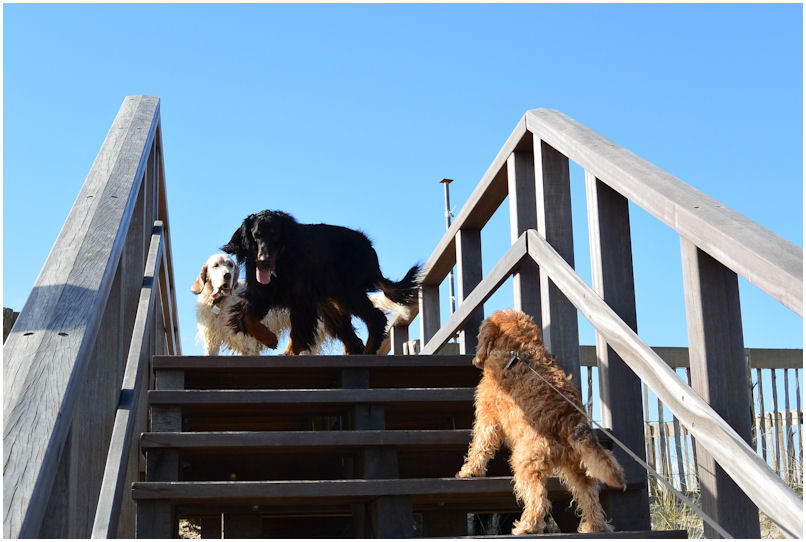 | De twee jongste spurten de trap op en af en Muisje kost dat iets meer moeite, ja natuurlijk ook omdat zij aan de lijn zat . . . de duinen lokten haar . . . |